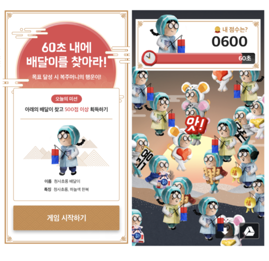 미니게임에서는 총 27종의 다양한 복장을 한 배달의민족 캐릭터 배달이를 만나볼 수 있다. 이용자는 미션으로 제시된 특정 배달이를 제한시간 내 빠르게 찾아낼수록 높은 점수를 얻는다. 목표점수를 달성한 모든 이용자는 할인쿠폰이 제공된다.