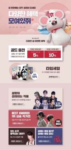 웹소설 연재 플랫폼 문피아는 31일까지 타임 세일 이벤트를 진행한다. 해당 기간 최대 50% 할인된 가격으로 작품을 즐길 수 있다. 같은 기간 진행되는 ‘설맞이 설레는 작품 보러 가야쥐!’ 이벤트는 화제의 인기 연재작 30여종이 참여하며 무려 1613화 분량을 무료로 만나볼 수 있다. 또 1월 23일부터 단 3일간 운영되는 골드 충전 이벤트는 기간 내 문피아 골드 충전 시 충전 금액의 최대 10%까지 추가 골드를 지급한다. 같은 날 오픈하는 출석 체크 이벤트는 31일까지 9일간 운영되며 본인 인증을 완료한 회원에 한해 기간 내 문피아 앱 접속 시 무조건 선물 골드를 지급한다. 이벤트 기간 동안 매일 출석 시 추가 골드를 지급하며 해당 이벤트는 앱 환경에서만 참여할 수 있다.