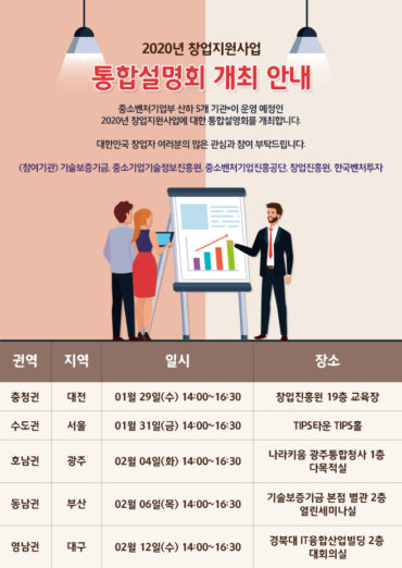 창업진흥원이 1월 29일부터 2월 12일까지 전국 5개 지역에서 2020년 중소벤처기업부 창업지원사업 통합설명회를 개최한다고 밝혔다.