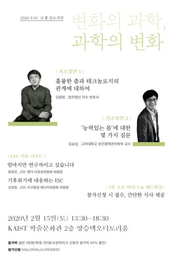 ◇[2월 15일 토요일] = 2020 ESC 공개 심포지엄 “변화의 과학, 과학의 변화“ = 사단법인 변화를 꿈꾸는 과학기술인 네트워크(ESC)가 2020 ESC 공개 심포지엄을 오는 2월 15일 토요일 KAIST 학술문화관 양승택오디토리움에서 주최한다. ‘변화의 과학, 과학의 변화’라는 주제로 진행되는 이번 심포지엄에서는 기조 강연, ESC 이슈 리포트, 참여자가 직접 참여하는 3분 오픈 마이크 및 네트워킹이 진행된다. 기조 강연에는 △김원영 법무법인 덕수 변호사 △김승섭 고려대 보건정책관리학부 교수가 연사로 나선다. ESC 이슈리포트에는 △윤정인 ESB 젠더다양성위원회 위원장 △조천호 ESC 지구환경에너지위원회 위원장이 참여한다.