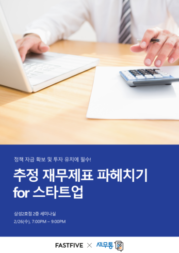 ◇[2일 26일 수요일] = [FIVE Comm.] 추정 재무제표 파헤치기 for 스타트업 = 패스트파이브와 세무통이 함께 추정 재무제표 파헤치기 for 스타트업 행사를 오는 2월 26일 수요일 패스트파이브 삼성 2호점 2층 세미나실에서 진행한다. 이번 행사는 사업 초기 정책 자금 확보 및 투자 유치에 필수인 추정 재무제표에 대한 정보를 제공하고자 마련됐다. 자리에서는 투자자가 회사의 추정 재무제표를 바라보는 관점을 배우고 공인회계사 출신 스타트업 대표와 함께 추정 재무제표를 함께 작성할 수 있다. 회계 및 세무 비전공자인 스타트업 대표 및 예비 창업자, 별도의 재무 담당자가 없는 스타트업 대표, 정부 정책 자금 및 투자 유치를 위한 사업계획서를 작성해야 하는 이, 추정 재무제표 작성이 필요한 이에게 적합하다.