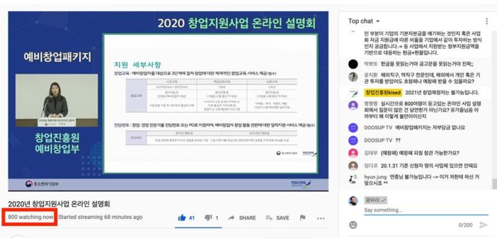 창업진흥원이 유튜브를 통해 2020년 창업지원사업 온라인 설명회를 진행했다. 초기창업패키지와 창업도약패키지, 팁스(TIPS) 프로그램, 사내벤처육성 프로그램, 글로벌 액셀러레이팅, 코리아스타트업센터, 예비창업패키지와 창업기업지원서비스바우처, 창조경제혁신센터/중장년기술창업센터/판교밸리창업존, 청소년비즈쿨, 메이커스페이스, 재도전 성공패키지, 실전창업교육, 1인창조기업 활성화, 도전! K-스타트업, 컴업 2020까지 사업별 내용을 자세하게 온라인을 통해 소개했다. 영상은 지원 사업별로는 자세한 내용을 담은 PPT와 실제 담당자를 PIP 화면으로 띄워 직접 설명하는 형태로 진행했다. 이번 온라인 설명회 자체가 2월 4일 16시부터 진행한 창업진흥원 지원사업 설명회를 생중계하는 형태로 이뤄졌기 때문. 유튜브 생중계 페이지에서는 실시간 질의응답도 이뤄졌다. 관련 사항을 문의하면 창업진흥원 측 담당자가 실시간으로 답변을 달아주는 식으로 궁금증을 곧바로 해결해준 것. 창업진흥원 측에 따르면 이번 온라인 설명회는 최대 동시접속자가 800명을 넘어섰다는 설명이다. 김광현 창업진흥원장은 자신의 페이스북에 “양방향 소통 요구가 크다는 걸 절감했다”고 밝혔다. 중소벤처기업부 시책은 이곳에서 확인할 수 있다.