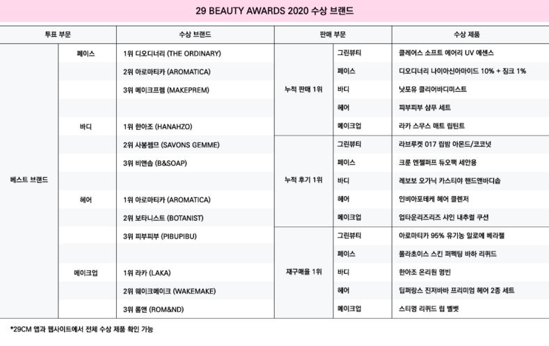 29 뷰티어워즈 2020 수상 내역은 29CM 앱과 웹사이트에서 더 자세히 확인할 수 있다.