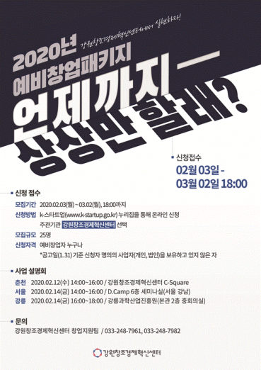 강원창조경제혁신센터가 3월 2일까지 2020년 예비창업패키지 참가기업을 모집한다고 밝혔다. 모집 규모는 청년 15명, 중장년 10명 등 25명. 사업 공고일 기준 창업 경험이 없거나 신청자 명의 사업체를 보유하지 않았다면 거주지나 창업예정지 관계없이 신청할 수 있다.