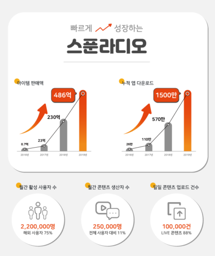 스푼라디오는 우리나라와 일본, 미국 등 서비스 국가를 10개로 확장했다. 누적 다운로드 수는 1,500만 회이며 활성사용자 수는 220만명, 매일 오디오 콘텐츠 10만개가 생산되고 있다. 오는 4월 미국 샌프란시스코에 지사 개소도 준비하고 있다.