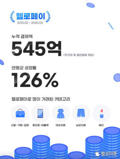 2015년 2월 서비스를 개시한 헬로페이는 연평균 126%의 성장률을 보이며 출시 5년 만에 헬로페이(직거래 및 일반 결제 제외) 누적 결제액 545억 원을 기록했다. 최근 2년간 누적 결제액은 약 400억 원이다.