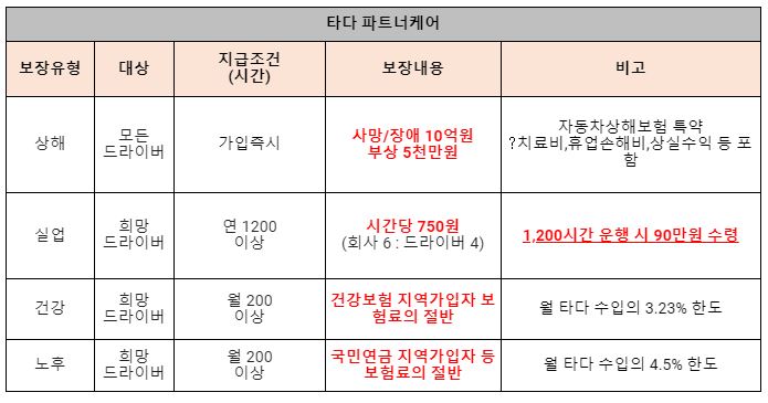 실업 ▲ 질병 ▲노령케어 등은 타다를 전업으로 삼아 일정시간 이상 운행하는 드라이버들이 본인 의사에 따라 선택해 가입한다. 비용은 회사와 드라이버가 서로 분담한다.