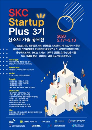 울산창조경제혁신센터가 3월 13일까지 SKC 스타트업 플러스 3기 참여기업을 모집한다.