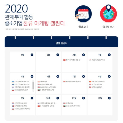 한류 캘린더 플랫폼은 한류를 활용한 중소기업 해외마케팅 사업을 추진하는 6개 부처 한류 행사 정보를 한눈에 볼 수 있다. 6개 부처는 중기부와 문체부, 산업부, 농식품부, 복지부, 식약처다. 또 올해 부처별 한류 행사 정보를 연간, 월별, 수출 국가별로 자세하게 조회할 수 있도록 세부 페이지 기능도 추가했다. 그 밖에 고비즈코리아 홈페이지에 개설하고 부처 홈페이지와도 한류 캘린더 배너를 걸어 연계를 지원할 방침이다. 그 밖에 부처별 행사와 공고 일정 등을 주기적으로 업데이트해 정보 활용을 강화할 예정이다.