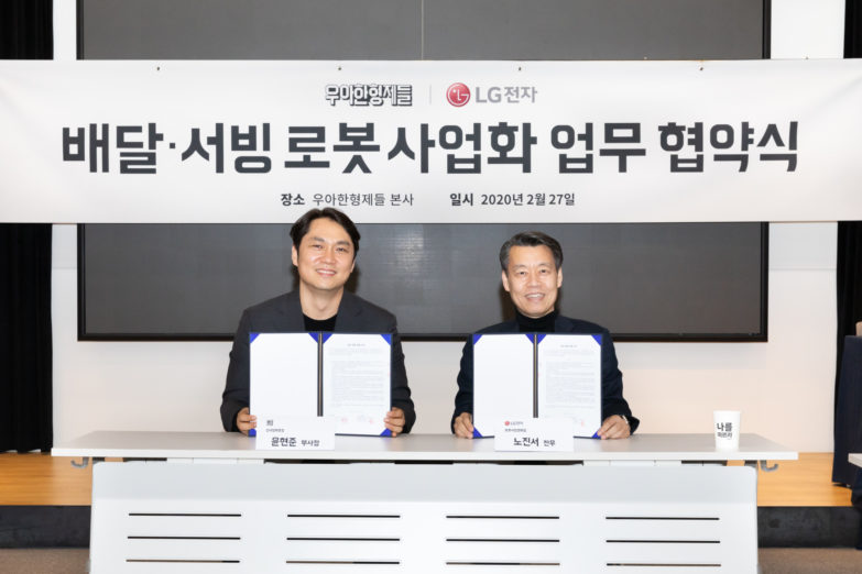배달의민족을 운영하는 우아한형제들은 지난 27일 서울 송파구 본사에서 LG전자와 배달·서빙 로봇 관련 사업에 관한 업무제휴 양해각서(MOU)를 체결했다. 양사는 이번 MOU를 통해 접객로봇부터 주문접수, 서빙, 퇴식 업무를 수행하는 자율주행형 로봇을 개발 및 시범운영하고 우아한형제들 전용 로봇을 공동개발 하는 등 배달로봇에 대한 폭넓은 협력을 진행해나갈 계획이다. 또 한국로봇산업진흥원에서 모집 중인 2020년도 서비스 로봇 활용 실증사업 지원과제에도 컨소시엄을 이뤄 지원한다.