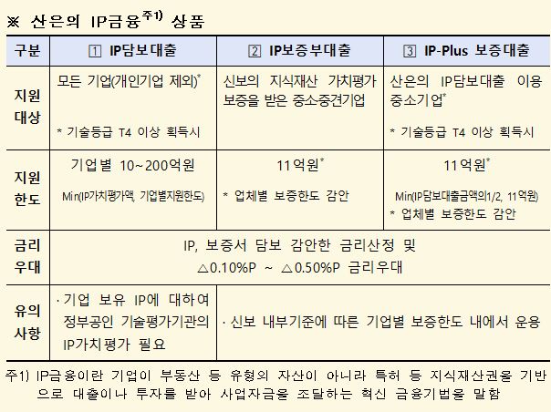 이번 대출은 산은의 IP 담보 대출을 이용하는 중소기업을 대상으로 신보가 보증서를 발급하고 산은이 IP담보대출금액 50% 범위에서 기업당 11억원까지 운전자금을 추가 지원하는 상품.