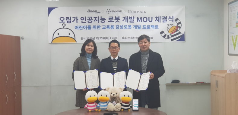 더플랜지, 드림휴, 미스터마인드 3사가 어린이 교육용 감성 로봇 개발을 위한 업무협약을 맺었다.