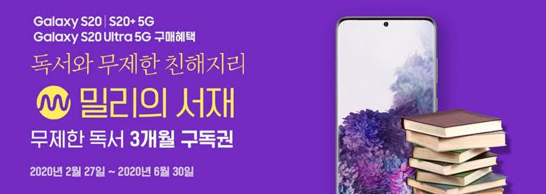 밀리의 서재와 삼성전자에 따르면 갤럭시 S20 시리즈 3종(S20, S20+, S20 울트라) 구매자에게는 밀리의 서재 3개월 무료 구독 혜택이 제공된다. 구글 스토어나 삼성 멤버스 앱을 통해 밀리의 서재 앱을 다운받아 실행시키기만 해도 3개월 무료 구독권이 자동으로 적용된다. 혜택 기간은 6월 30일까지다.