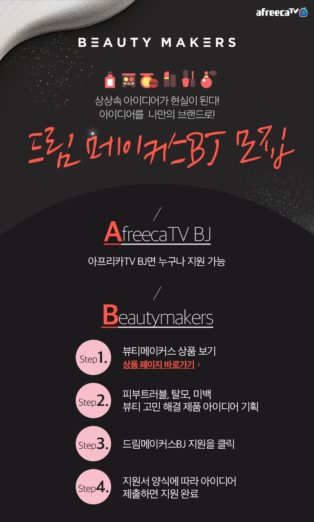 뷰티 제조 소셜 펀딩 플랫폼 뷰티메이커스가 아프리카TV와 함께 드림 메이커스 BJ 콘테스트 모집을 시작했다. 이번 콘텐스트는 BJ의 상상 속 아이디어를 실현하다를 모토로 뷰티메이커스와 아프리카TV 가 함께 기획한 프로모션 캠페인이다.