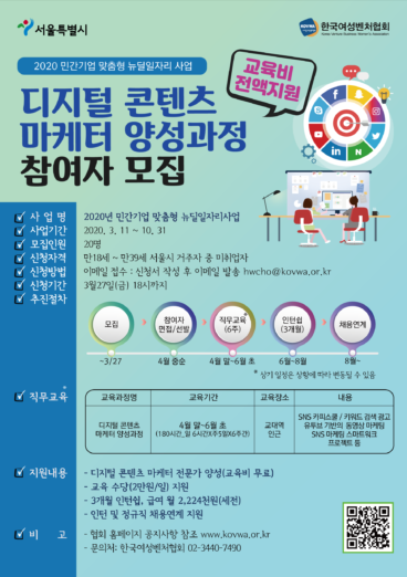 한국여성벤처협회가 서울시와 민간기업 맞춤형 뉴딜일자리사업 ‘디지털 마케팅’ 분야 청년 취업희망자 20명을 27일까지 모집한다고 밝혔다.