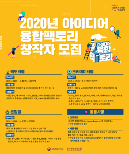 문화체육관광부와 한국콘텐츠진흥원(이하 콘진원)이 2020 아이디어 융합팩토리 프로그램에 참여할 창작자를 모집한다. 올해 아이디어 융합팩토리는 ▲팩토리랩(융합 콘텐츠 및 응용기술 분야) ▲크리에이터랩(온라인·디지털 뉴미디어 콘텐츠 분야) ▲론칭랩(아이디어 융합팩토리 수료자 후속 사업화 지원)의 3개 분야, 총 80여 개 팀을 선정한다. 아이디어 융합팩토리’는 2014년부터 시작해 지난 6년 간 총 615건의 아이디어를 발굴하고 콘텐츠 제작활동비와 맞춤형 멘토링을 지원했다.