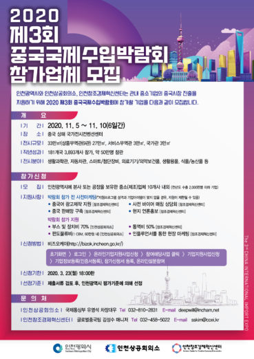 인천광역시와 인천창조경제혁신센터, 인천상공회의소가 제 3회 중국국제수입박람회 참가 기업을 공동 모집한다고 16일 밝혔다.