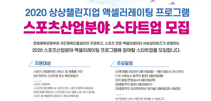 국민체육진흥공단과 상상이비즈가 스포츠산업분야 액셀러레이팅 프로그램 참여기업을 4월15일까지 모집한다. 상상력과 사업성이 풍부한 유망 스타트업의 육성·지원을 통해 스포츠산업 발전과 일자리 창출을 도모한다는 취지다. 스포츠 산업분야 서비스 및 제품을 가진 예비 창업자, 5…