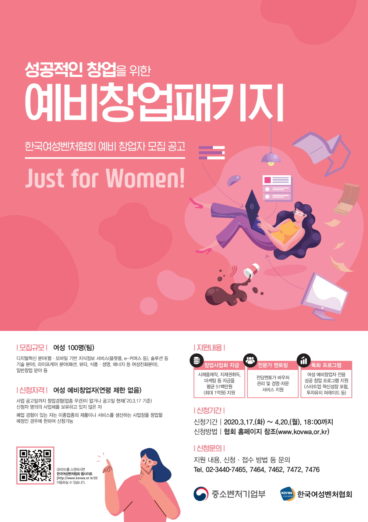 한국여성벤처협회가 2020년 예비창업패키지 여성 특화분야(이하 창업패키지)에 참여할 여성 예비창업자를 4월 20일까지 모집한다.