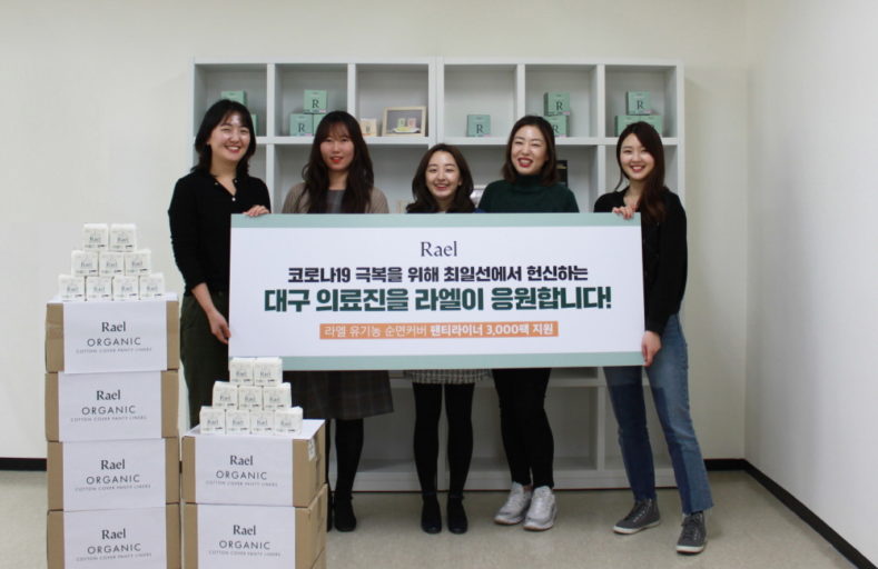 라엘이 대구 지역 여성 의료진에게 여성용품을 지원했다. 3월 20일 대구 적십자사에 1,500만원 상당 라엘 팬티라이너 3,000팩을 기부한 것. 기부용품은 대구 코로나19 전담 의료기관에 전달된다.