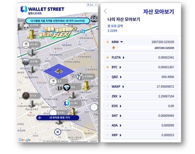 또 다른 중요 기능은 암호화폐 거래소별로 흩어진 자산을 월렛 스트리트 안에서 한꺼번에 확인할 수 있다는 것이다. 일일이 거래소마다 로그인할 필요가 없다. 자신의 자산을 인증할 때에도 자신의 현재 위치를 기반으로 가상 건물을 생성하고 이를 바탕으로 여러 활동을 한다. 앞으로 업데이트를 통해 다양한 활동을 실제 위치 1km 반경 이내에서 진행해 색다른 재미를 선사할 예정이다.