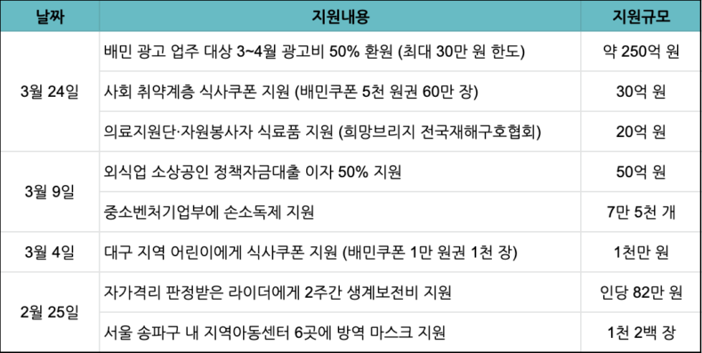 주요 대책은 ▲업주당 최대 30만 원 한도 내에서 3~4월 광고비·수수료 50% (약 250억 원) 환원 ▲사회 취약계층에 30억 원 규모 식사쿠폰 지원 ▲의료지원단·자원봉사자 식료품 20억 원 어치 지원 등 크게 세 가지다.