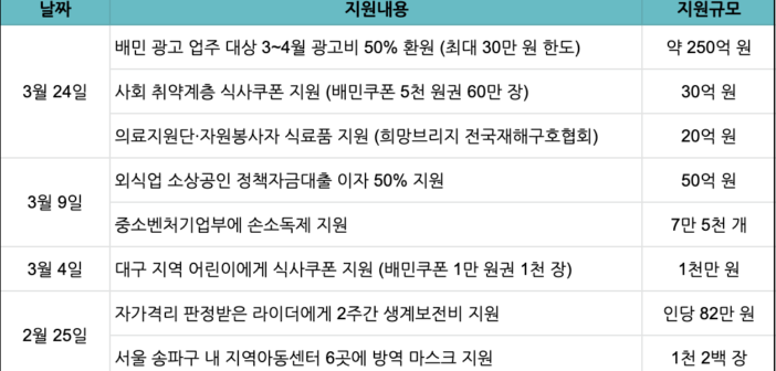 배달의민족 운영사인 우아한형제들이 코로나19 극복을 위한 사회적 나눔 운동에 동참한다고 24일 밝혔다. 우아한형제들은 3~4월 간 배달의민족 입점 업체 14만 여 곳에 광고료 일부 환급을 포함한 300억 원 규모 소상공인 긴급지원 대책을 마련했다. 주요 대책은 ▲업주당 최대 30만 원 한도 내에서 3~4월 광고비·수수료 50% (약 250억 원) 환원 ▲사회 취약계층에 30억 원 규모 식사쿠폰 지원 ▲의료지원단·자원봉사자 식료품 20억 원 어치 지원 등 크게 세 가지다. 먼저 소상공인들을 위해 코로나19로 인한 피해가 본격화한 3~4월 광고료의 절반을 돌려주기로 했다. 한 업소당 지원금은 최대 30만 원(3, 4월 각 15만 원씩)으로 정했다. 이에 따라 업주들은 3월 울트라콜·오픈리스트 이용 금액의 50%를 최대 15만 원까지 4월 말에 업소 계좌로 돌려받게 된다. ‘오픈서비스’ 도입으로 수수료 모델이 확대되는 4월에도 오픈서비스 이용료와 울트라콜 광고료의 50%를 최대 15만 원까지 5월 중순 경에 계좌로 돌려받게 된다. 이번 3~4월 광고료 50% 지원으로 약 250억 원이 소상공인들의 통장에 입금된다. 기초생활수급자, 장애인 등 사회 취약계층 식사 지원에도 나선다. 우아한형제들은 초록우산어린이재단에 30억 원을 기부하기로 했다. 이 돈은 배민 쿠폰 60만 장을 지원하는 데 쓰인다. 취약계층 1만 명이 30일간 끼니를 해결할 수 있는 규모다. 배민 쿠폰은 개학 지연으로 끼니 해결에 어려움을 겪고 있는 어린이들과 식사 준비에 곤란을 겪는 장애인 등에 지원된다. 우아한형제들 측은 소비자가 결제 시 취약계층 지원용 쿠폰을 사용했는지 여부를 음식점주도 알 수 없도록 했다. 코로나19 방역과 진단, 치료에 전념하고 있는 의료진과 자원봉사자들을 위한 식료품도 지원한다. 이를 위해 우아한형제들은 20억 원을 희망브리지 전국재해구호협회에 기부하기로 했다. 기부금은 의료현장에서 땀 흘리는 의료진과 자원봉사자들에 식료품을 전달하는 데 쓰인다. 김범준 우아한형제들 대표는 “코로나19 사태가 장기화하면서 소상공인은 물론 소비자들도 어려움에 처해 있다”며 “이번 긴급지원대책이 코로나19를 극복하고 안정적인 일상으로 돌아갈 때까지 조금이나마 보탬이 되길 바란다”고 말했다.