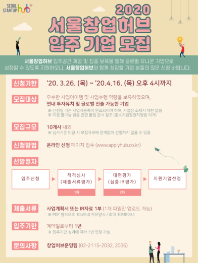 서울창업허브가 센터 입주 기업을 4월 16일까지 모집한다. 서울창업허브는 서면심사와 대면심사를 거쳐 10개 사 내외를 선발하며 선발 기업은 5월부터 서울창업허브 지원을 받는다. 최종 선정 후에는 본점 또는 주된 사무소를 2개월 이내로 서울창업허브로 이전해야 하며 접수 시에는 사업장 소재지 제한이 없으나 신청일 기준으로 사업자등록증은 보유하고 있어야 한다.
