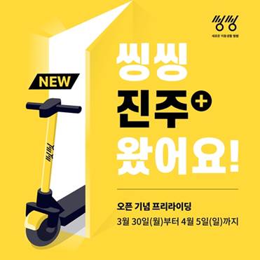 진주 지역 진출을 기념해 오는 30일부터 4월 5일까지 일주일 간 씽씽 프리라이딩 이벤트를 진행한다. 씽씽 정회원이라면 누구나 진주 지역 내에서 하루 한 번 10분씩 무료로 이용 가능하다. 이후는 정상 과금 된다.