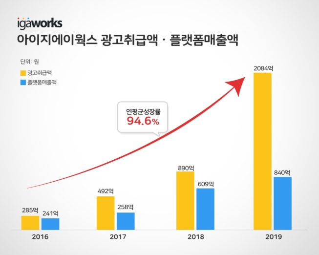 이와더불어 아이지에이웍스는 큰 폭으로 성장한 2019년도 실적도 발표했다. 아이지에이웍스의 2019년 연간 광고취급액은 전년 대비 2.34배 증가한 2,084억 원으로 2016년이후 94.6%의 연평균 성장률(CAGR)을 기록했으며 플랫폼매출액 역시 840억 원으로 증가했다. 아이지에이웍스는 코로나19로 인한 전반적인 경기침체 속에서도 1분기 월 광고취급액이 역대 최고인 280억 원을 넘기는 등 2020년 총 광고취급액 3,000억원 규모를 무난하게 달성할 것으로 예상된다.