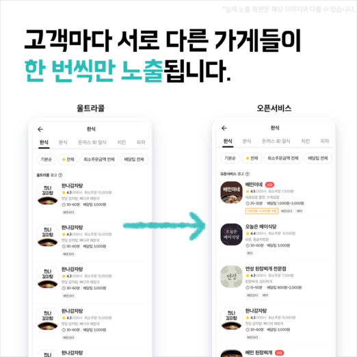 셋째 앱 상에서 가게 이름이 노출되는 영역이 다양해진다. 오픈서비스에 등록한 가게는 메뉴별 카테고리 외에 최근 고객들로부터 높은 인기를 얻고 있는 1인분 카테고리 등에 자동 노출된다. 한식, 일식 등의 기존 카테고리 외에도, ‘제철음식 기획전’, ‘전복요리 특별전’처럼 수시 기획 코너에 노출될 수 있는 기회도 확대될 예정이다. 기존에는 울트라콜 이용 업소가 1인분 카테고리 같은 별도 코너에 입점하려면 광고 상품을 따로 구입해야만 했다.