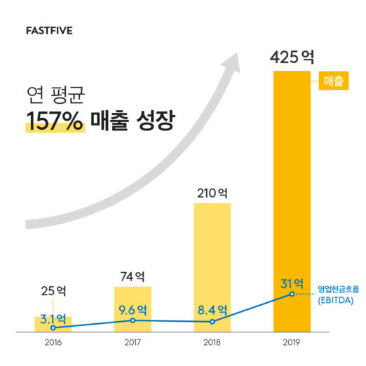 2019년 매출은 425억 원이다. 전년도 매출 210억 대비 2배 이상 성장한 수치다. 운영 중인 23개 호점 평균 공실률을 3%다. 2015년 설립 이후 연평균 매출은 157% 증가했다.