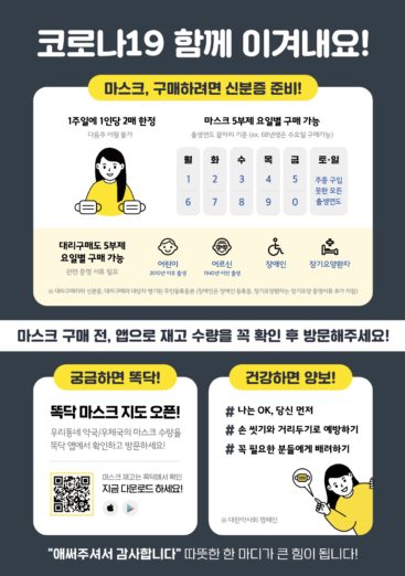 마스크 구매 안내 캠페인은 ▲공적 마스크는 마스크 5부제에 맞춰 신분증 지참 후 구매 가능 ▲똑닥 ‘실시간 마스크 지도’ 서비스로 약국 마스크 재고량 확인 후 대기 없이 구매 ▲본인이 건강하다면 더욱 필요한 사람을 배려하여 구매를 양보하자는 내용으로 구성됐다.