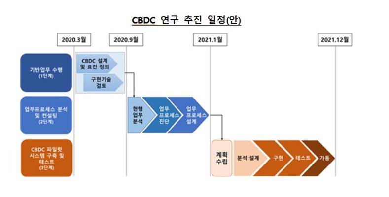한국은행, CBDC 파일럿 테스트 추진중=한국은행이 현재 중앙은행 디지털화폐(CBDC) 파일럿 테스트를 추진 중인 것으로 확인됐다. 한은에 따르면 테스트는 CBDC 설계 및 요건 정의, 구현기술 검토, 업무프로세스 분석 등의 기술 검토와 법률 검토가 함께 진행될 예정이다. 테스트는 이미 지난달 시작됐고 연구 기간은 내년 12월까지 약 22개월이다.