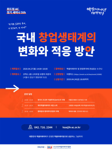 한국액셀러레이터협회가 4월 27일 코엑스 스타트업브랜치에서 액셀러레이터와 창업투자자를 위한 제5회 위드업AC 정기 세미나를 연다고 밝혔다.