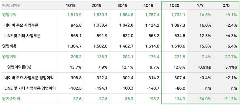 네이버는 2020년 1분기에 영업수익(매출) 1조 7,321억 원, 영업이익 2,215억 원, 당기순이익 1,349억 원을 각각 기록했다고 밝혔다. 1분기 연결 영업수익은 비즈니스플랫폼 사업부문의 매출 확대, 네이버페이와 웹툰의 성장에 따라 전년동기 대비 14.6% 증가한 1조 7,321억 원을 기록했다. 연결 영업이익은 전년동기 대비 7.4%, 전분기 대비로는 27.7% 증가한 2,215억 원이다. 이 중 네이버 주요 사업부문의 연결 영업이익은 3,074억 원이다.
