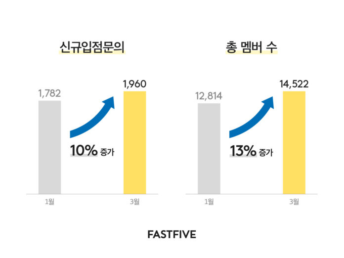 패스트파이브는 코로나19가 본격 확산되기 전 올해 1월과 비교해 3월 기준 1,960개의 신규 입점 문의가 발생했다고 밝혔다. 이는 1월 1,782건의 입점 문의와 비교해 10% 증가한 수치다. 패스트파이브 전 지점의 총 멤버 수 역시 코로나19 이전인 1월 대비 13% 증가한 14,522명을 기록하는 등 코로나19와 무관하게 많은 고객을 유치하고 있다.