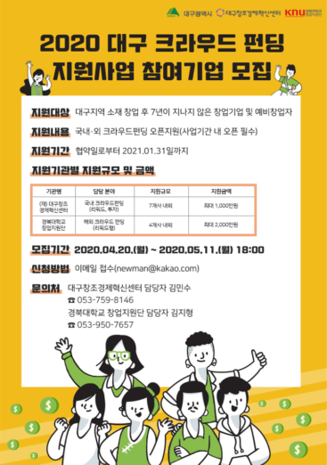 대구창조경제혁신센터(이하 대구혁신센터)는 오는 5월 11일까지‘2020년 대구 크라우드펀딩 지원사업’의 참여기업을 모집한다고 밝혔다.
