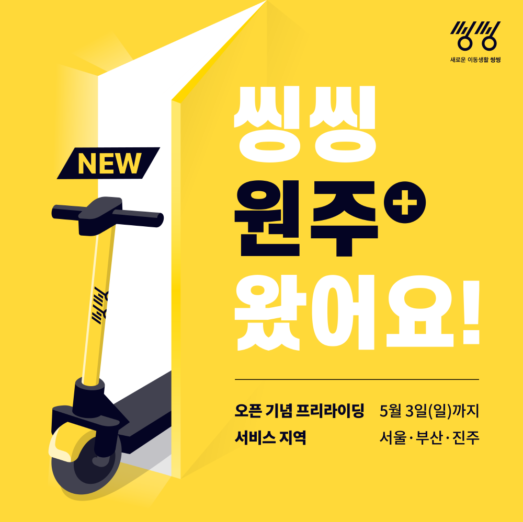 씽씽은 지난해 5월 서울을 시작으로 부산과 진주로 운영 지역을 확장한 바 있다. 회사 측은 원주 지역 확장에 맞춰 5월 3일까지 씽씽 프리라이딩 이벤트를 열어 연세대 원주캠퍼스, 원주 종합체육관, 상지대 인근에 배치한 씽씽을 무료 체험할 수 있도록 할 예정. 씽씽 앱을 설치한 회원 누구나 원주에서 하루 한 번 10분간 무료 라이딩을 해볼 수 있다.