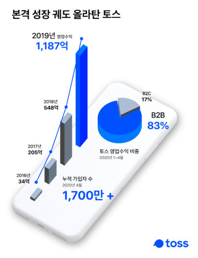 토스 영업수익은 수익화를 본격적으로 시작한 2016년 34억 원 이후 2019년 1,187억 원을 기록하며 지난 3년간 약 35배 성장했다. 회원 수는 1,700만으로 올해 기준 영업 수익 83%는 제휴 금융기관과 온라인 사업자 등 B2B에서 발생했다. 토스는 추후 영업 수익 규모가 확대되면서 본격적인 이익 성장 궤도로 진입할 것으로 예상했다.