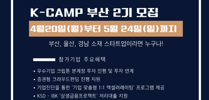 한국예탁결제원(이하 한국예탁원)이 K-Camp 부산 2기 기업을 24일까지 모집한다. 부산,울산,경남에 소재한 스타트업 및 예비창업자를 선발하는 이번 프로그램은 액셀러레이터 크립톤이 기업가정신, 비즈니스 모델,투자 유치, 마케팅 등 실제 스타트업 창업팀에 필요한 교육 및 멘토링을 실시한다. K-Camp 부산 1기 팀 중 친환경 소재 개발 스타트업 ‘마린이노베이션’과 물류 스타트업’리턴박스’,육아정보 스타트업’애기야가자’는 투자 유치에 성공한 바 있다. 2기 모집에는 핀테크, 블록체인, 물류 스타트업들을 선발할 예정이며 프로그램 기간 동안 우수한 성과를 낸 참가팀에게는 해외 투자유치의 기회가 주어진다. 또 2기 선발기업 전원에게는 BIFC 코워킹스페이스 입주 지원, 멘토링, 국내외 VC와의 네트워킹, 크라우드 펀딩 지원,글로벌 진출 등 다양한 혜택이 제공된다. 참여 신청은 K-Camp 부산 홈페이지에서 하면 된다.