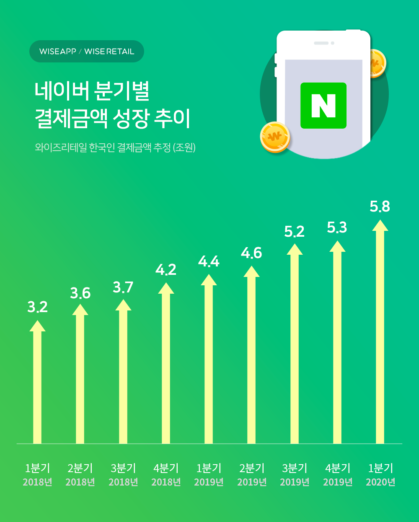 한국인이 지난 1분기 네이버에서 신용카드, 체크카드, 계좌이체, 소액결제로 결제한 금액을 표본 조사한 결과 역대 최고 결제 금액인 5.8조 원으로 조사됐다. 앱/리테일 분석서비스 와이즈앱/와이즈리테일에 따르면 지난 3월 네이버 결제금액은 역대 최대인 2.3조 원을 기록한 것으로 나타났다.