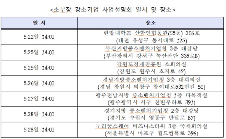 중소벤처기업부가 소재·부품·장비 강소기업 사업설명회를 5월 22일부터 28일까지 7개 지역에서 개최한다.