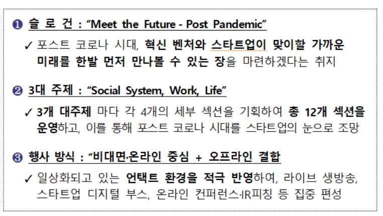 올해 컴업 2020의 슬로건은 미래를 만나다-포스트팬데믹으로 코로나 이후 스타트업 역할을 살펴보는 자리가 될 전망이다. 중기부와 조직위는 코로나19 확산 초기에 신속한 진단키트 개발·보급 등 우리 바이오 벤처기업 군단의 활약으로 K-방역이 전 세계 표준으로 자리 잡았듯 이번 행사를 포스트 코로나 시대 언택트 환경에 최적화된 주제와 방식을 통해 성공적으로 개최한다면, 세계인의 집중적인 관심을 받는 모범적 축제 모델로 도약할 수 있을 것으로 기대하고 있다.
