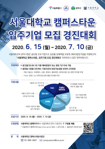 서울대학교 캠퍼스타운사업단은 글로벌 선도기업으로 성장할 창업기업을 양성하기 위해 ‘서울대학교 캠퍼스타운 입주기업 모집 경진대회’를 개최한다.