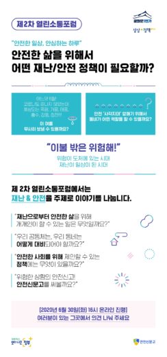 ◇[6월 30일 화요일] = 2020년 제2차 열린소통포럼 “재난이 일상이 된 시대, 우리에겐 어떤 정책이 필요할까?” = 행정안전부가 주최하는 2020년 제2차 열린소통포럼 “재난이 일상이 된 시대, 우리에겐 어떤 정책이 필요할까?”가 6월 30일 화요일 16시에 진행된다. 온라인 웨비나로 진행되는 이번 행사는 위험이 도처에 있고, 재난이 일상이 된 시대 속에서 안전한 삶에는 어떤 정책이 필요할지 함께 의논해 보기 위해 마련됐다. 이번 행사에서는 재난으로부터 안전한 삶을 위해 개개인이 할 수 있는 일은 무엇이 있을지, 우리 공동체와 우리 동네는 어떻게 대비되어야 하는지, 안전한 사회를 위해 제안할 수 있는 정책에는 무엇이 있을지 등을 함께 논의할 예정이다. 이번 행사는 패널들의 토론 위주로 진행되며, 참여자의 실시간 댓글을 중심으로 소통해 나갈 예정이다.