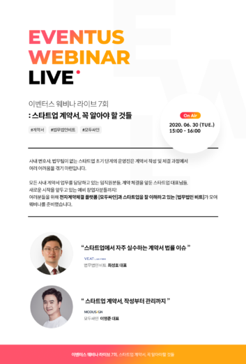 ◇[6월 30일 화요일] [EWLº] 이벤터스 웨비나 라이브 7회 스타트업 계약서, 꼭 알아야 할 것들 = 이벤터스가 주최하는 [EWLº] 이벤터스 웨비나 라이브 :: 7회 스타트업 계약서, 꼭 알아야 할 것들이 6월 30일 15시에 진행된다. 온라인 웨비나로 진행되는 이번 행사는 사내 변호사 및 법무팀이 갖춰지지 않은 초기 스타트업이 계약서 작성 및 체결 과정에서 겪는 어려움을 줄여 줄 수 있는 방법에 대해 알아보기 위해 마련됐다. 이번 행사에서는 IT·스타트업 법률 자문 다크호스인 △법무법인 비트 최성호 대표와 전자계약체결 플랫폼 △모두싸인 이영준 대표가 연사로 나서 ‘스타트업에서 자주 하는 계약서 법률 이슈’와 ‘스타트업 계약서, 작성부터 관리까지’라는 주제로 강연을 진행할 예정이다. 이번 행사는 스타트업에서 모든 계약서 업무를 담당하고 있는 임직원, 계약 체결을 앞둔 스타트업 대표(CEO), 새로운 시작을 앞두고 있는 예비 창업자라면 누구나 참여 가능하다.