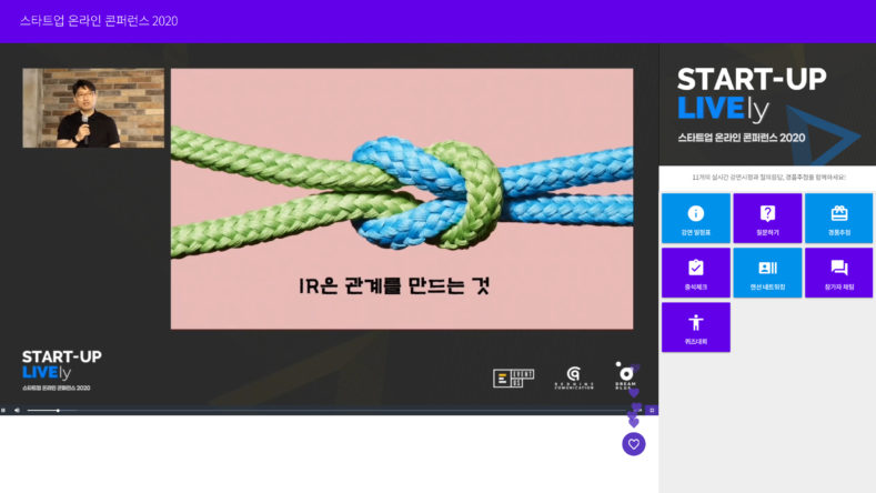 이벤터스에서 주최한 스타트업 온라인 콘퍼런스 2020은 행사 참가자가 웨비나를 시청하며, 한 페이지에서 실시간 질의응답, 부스 참여, 랜선 네트워킹, 출석체크, 서바이벌 퀴즈 대회까지 다양한 이벤트 프로그램을 동시에 참여할 수 있게 하였다. 참가자는 웨비나 시청 페이지에서 벗어나지 않은 채 자유로이 원하는 세션에 참여할 수 있어 행사 참여도를 높일 수 있었다.