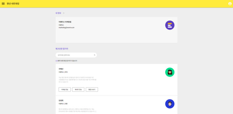 지난 스타트업 온라인 콘퍼런스 2020은 온라인으로 진행되는 행사임에도 참가자들 간에 온라인에서 명함을 주고 받으며, 소통할 수 있는 랜선 네트워킹을 진행했다. 네트워킹을 원하는 참가자는 이름 및 이메일 주소, 소속, 남기고 싶은 한 마디 등의 간단한 정보를 입력하면 다른 참가자들과 이메일 및 메시지 전송, 명함 보내기를 통해 네트워킹 할 수 있었다.