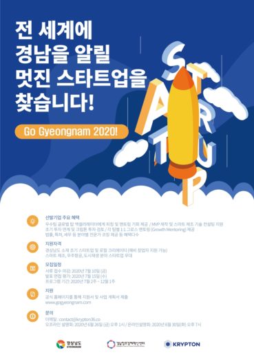 한편, 경상남도와 경남창조경제혁신센터, 액셀러레이터 크립톤은 경남형 특화 액셀러레이팅 프로그램 Go Gyeongnam 2020 지원사업을 실시하고 7월 10일까지 모집을 받고 있다. 모집 대상은 경남 소재 창업 7년 이내 스타트업 및 예비 창업자(팀)로, 총 10개사를 선발할 계획이다. 최종 선발 기업에 한해 △맞춤형 1:1 전담멘토링, △MVP(Minimum Viable Product) 제작지원 △Demoday(IR) 개최 및 피칭코칭, △투자연계 및 판로개척, △글로벌진출 등을 지원한다. 웨비나에 대한 자세한 내용 확인과 참가 신청은 이곳에서 할 수 있다.